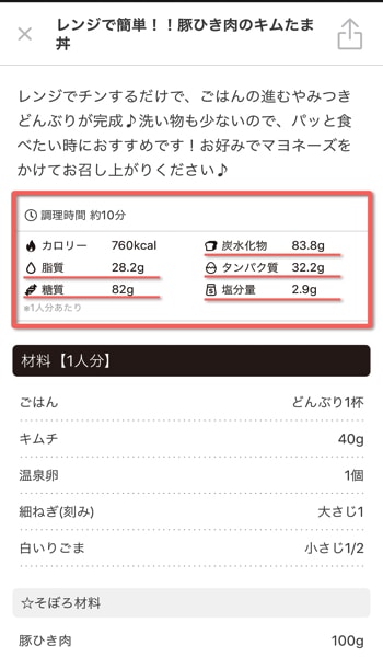 最近のアップデートで「カロリー」も分かるようになってます。ただ、まだ対応していないレシピもちらほらあります。